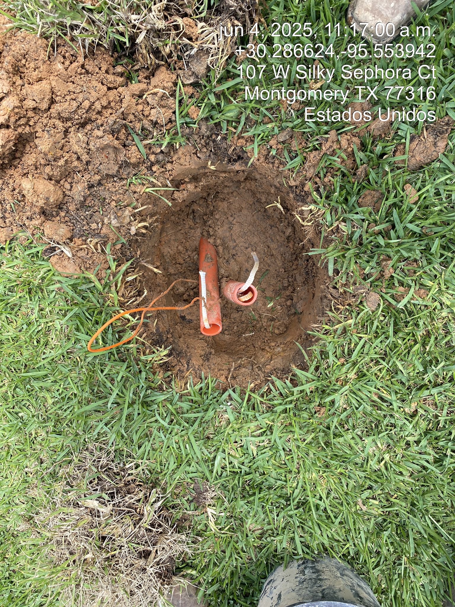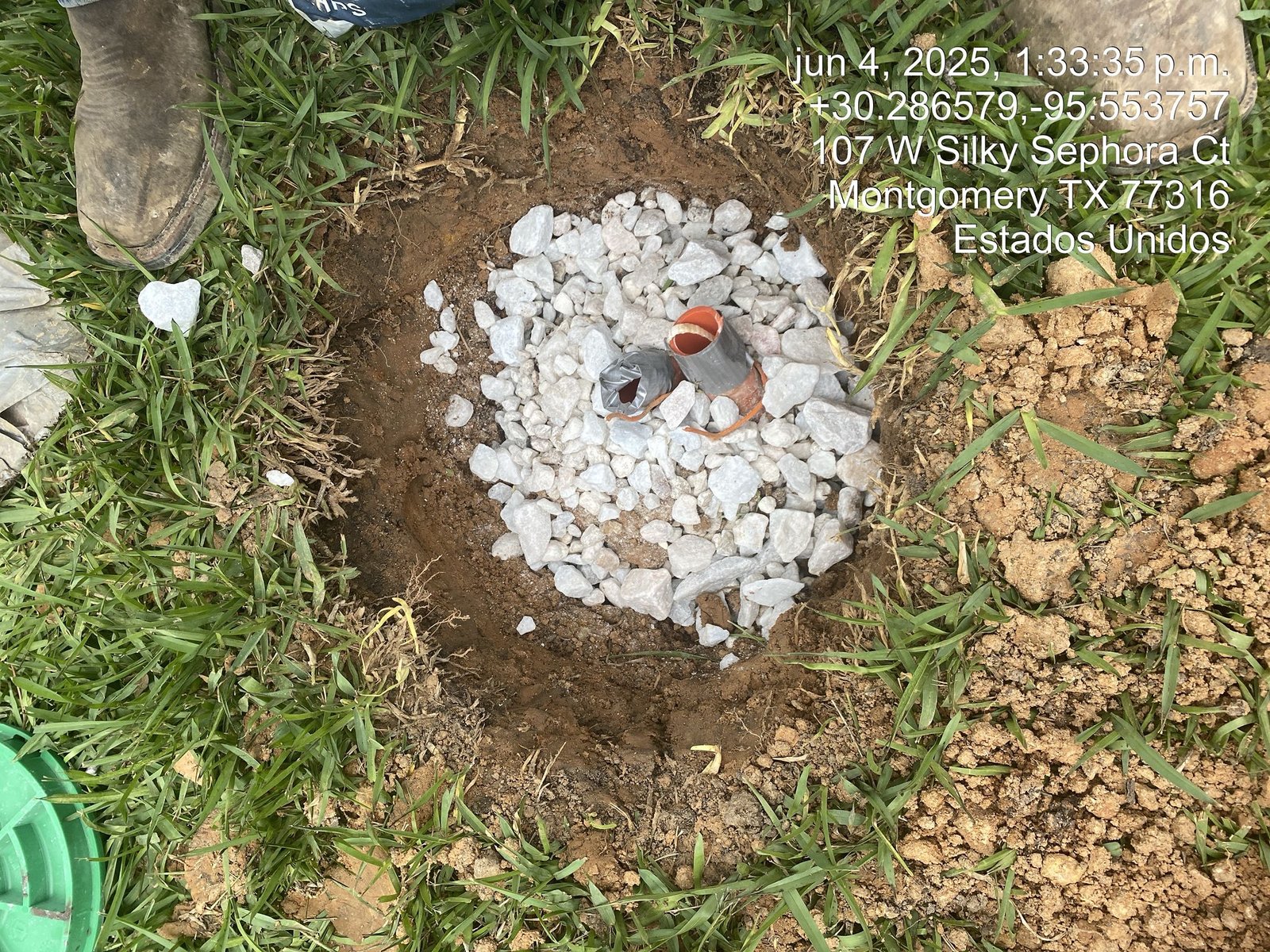 In the images above, you can see Directional Drilling of Texas LLC (DDoT) is contracted by Stallion Communications out of Jacksonville, Texas, to work on behalf of Ezee Fiber to install conduits and boxes on a street named E. Silky Sephora Ct, Montgomery, Texas. We are also able to show the process of installing a junction box of the Flowerpot type. In the first photo, you can see the conduits appearing through the soil; then you see the gravel added; then you see the box and more gravel added; and finally, the completed installation. In the final picture, the top is now in place, level with the surrounding ground.